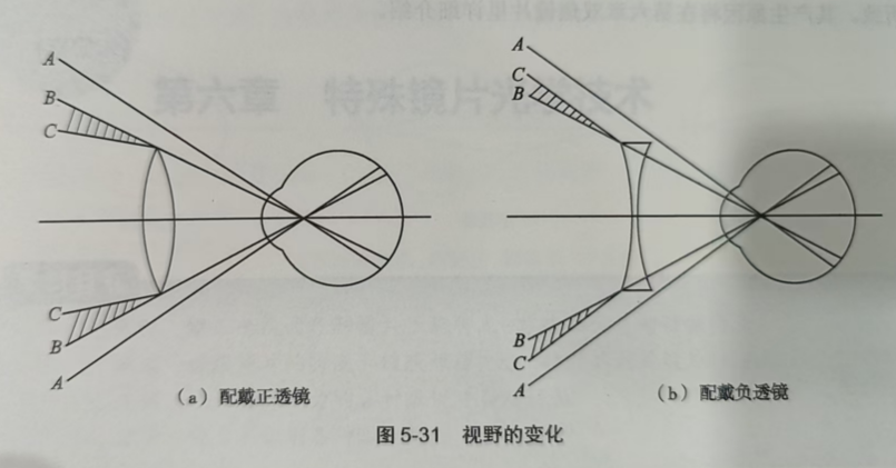 当眼注视正前方时,眼睛能看到的空间范围称为视野(visualfield)。由于眼镜片的棱镜效果,眼睛与镜片组成组合光学系统后的视野,和裸眼的视野有一定区别。如图5-31(a),远视眼配戴凸球面透镜,眼球注视正前方。光线C入射眼镜片的最边缘,因棱镜效果向光轴偏折,成为眼镜片矫正区域的视野边界。光线B是不经过眼镜片而直接入射眼球的边缘光线,光线A是正常眼球的视野边界,即A、B限定了不经过眼镜片而眼球能直接看到的非矫正区域。因此物体若在B和C之间的区域,将不能被眼睛看到,形成一个盲区。眼镜片周围的盲区呈环状,故称为环形盲区(ring scotoma)。环形盲区的大小与眼镜片的屈光度、镜片直径、镜片后顶点到瞳孔中央的距离有关。